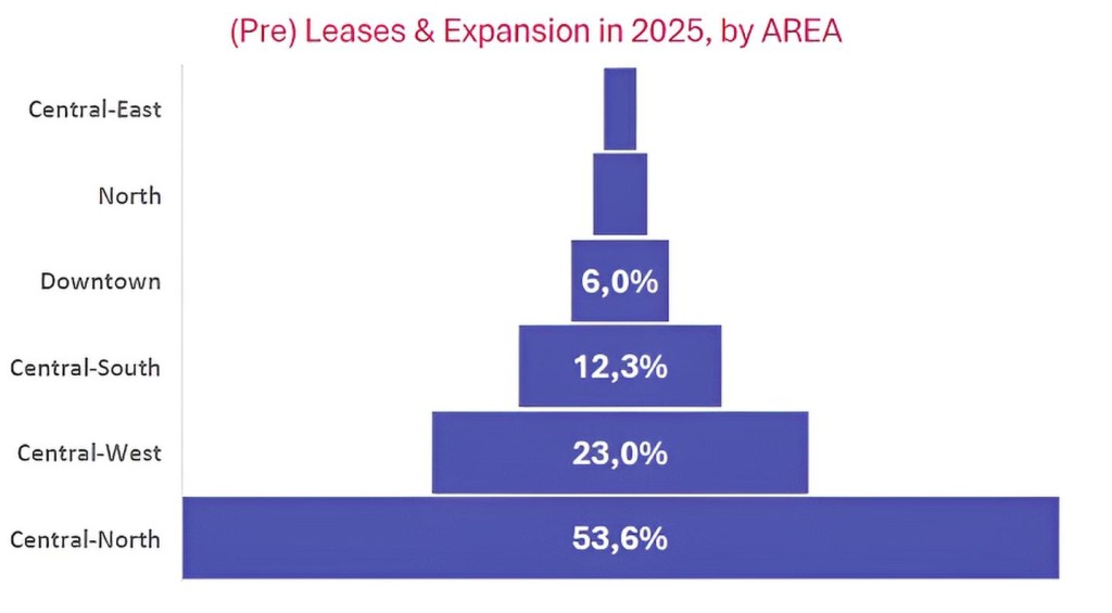 ▪ LOCATION. The most active submarket remained Center-North, accounting for 53.6% of total leased area, followed by Center-West with 23%.