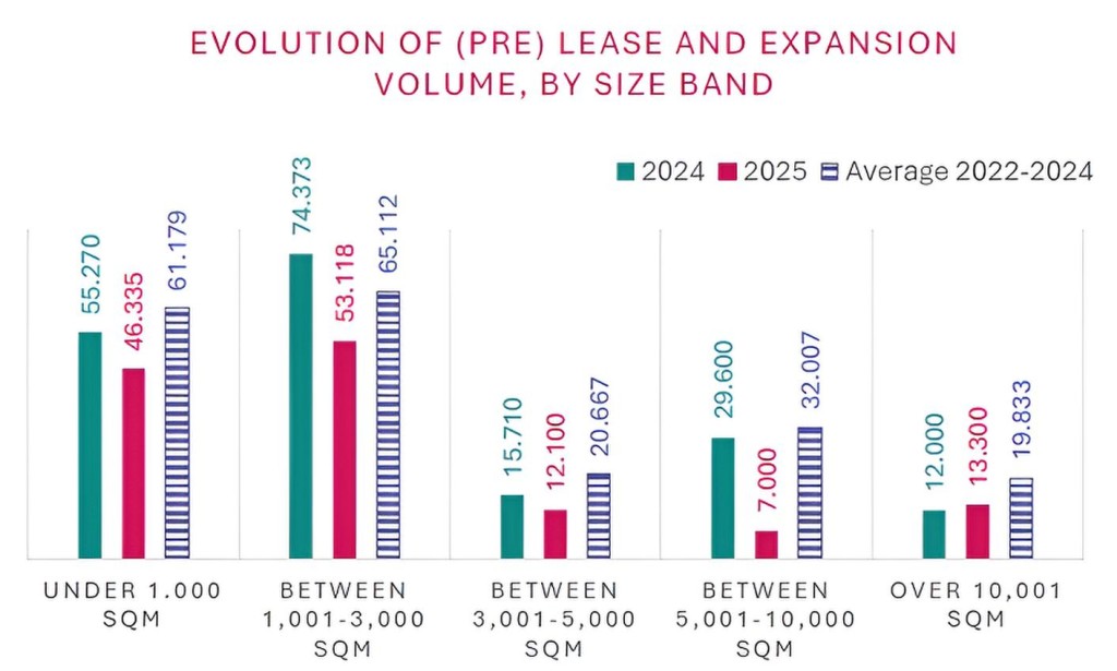 Size segments above 3,000 sqm recorded the strongest contraction, being the most affected by the limited delivery of new office projects over the past two to three years.