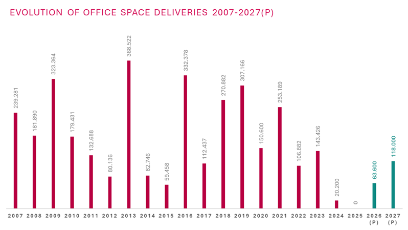 More substantial office developments, amounting to 118,000 sqm are scheduled for delivery in 2027.