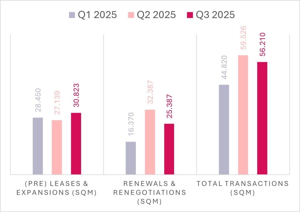 The highest total transaction volume was in Q2, supported by the higher number of renegotiation and extension transactions, while the maximum volume of new space rentals was recorded in Q3.