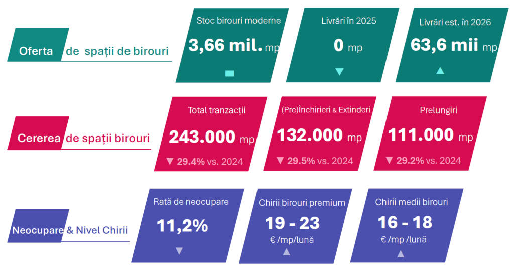 La finalul anului 2025, stocul de spații de birouri moderne, clasa A, a depășit 3,66 milioane mp, ajungând la un total de 4,21 milioane mp dacă sunt incluse și clădirile de birouri clasa B.