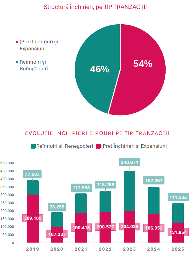 În 2025, volumul total tranzacționat a depășit 243.000 mp, din care aproximativ 132.000 mp (54%) reprezintă tranzacțiile de (Pre) Închiriere and Extindere, iar Prelungirile și Renegocierile contabilizează 111.000 mp (46%).