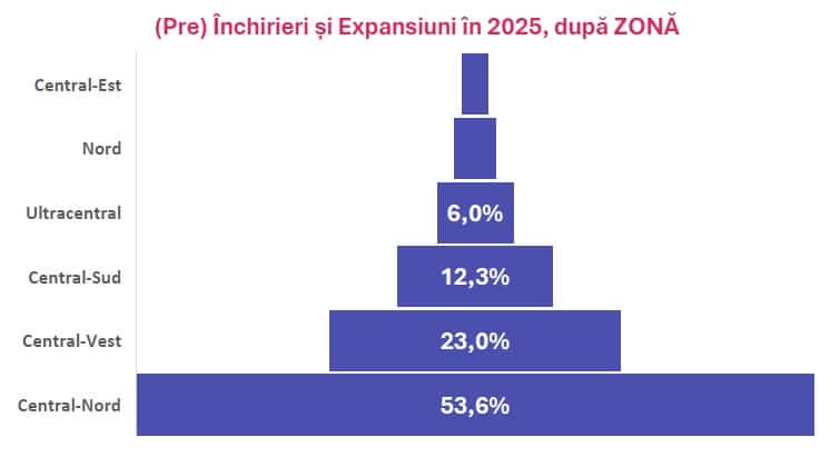 ▪ LOCAȚIE. Cea mai atractivă zonă a rămas Centru-Nord, cu 53,6% din spațiile nou închiriate, urmată de Centru-Vest cu 23%.