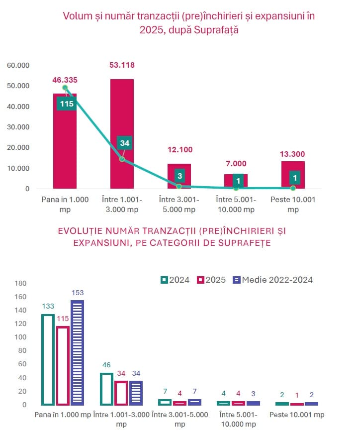 Dintre cele 154 de tranzacții finalizate în 2025, doar 5 au avut suprafețe de peste 3.000 mp, cu toate acestea totalizând aproape 25% din volumul total tranzacționat.