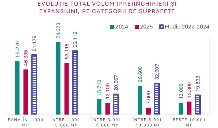 În 2025, volumul total tranzacționat a depășit 243.000 mp, din care aproximativ 132.000 mp (54%) reprezintă tranzacțiile de (Pre) Închiriere and Extindere, iar Prelungirile și Renegocierile contabilizează 111.000 mp (46%).