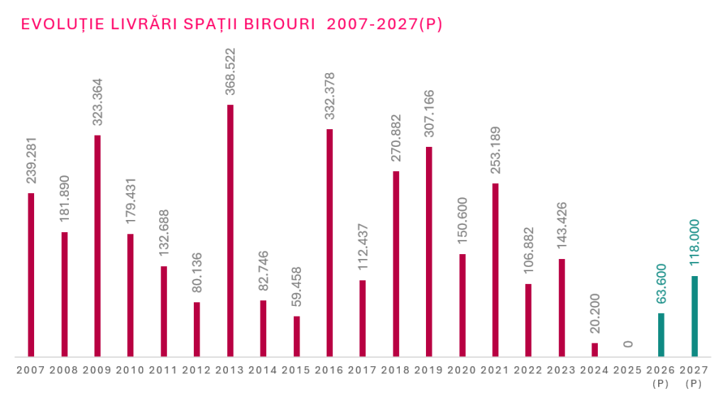 *Anul 2025 marchează primul an din ultimele două decenii în care nu a fost livrat niciun proiect de birouri clasa A, după un nivel istoric minim de doar 20.200 mp finalizați în 2024.
